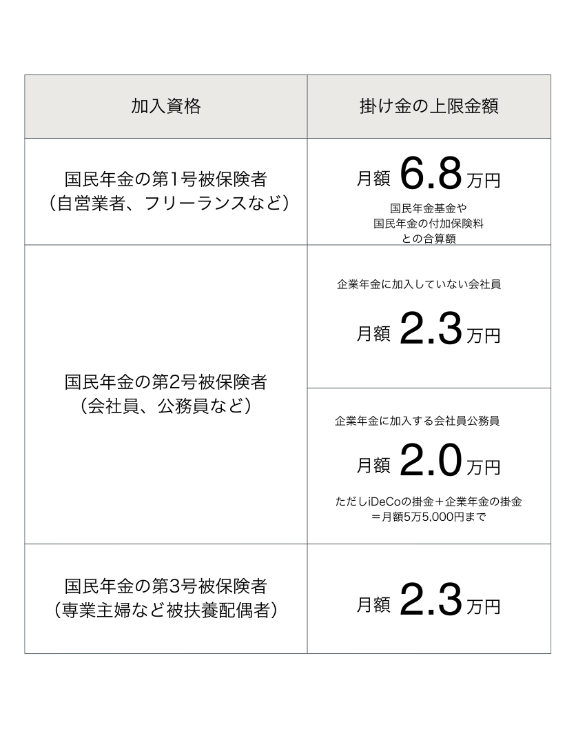iDeCoは公的年金への上乗せ制度であるため、国民年金の加入区分に応じて加入資格拠出限度額が定められています。