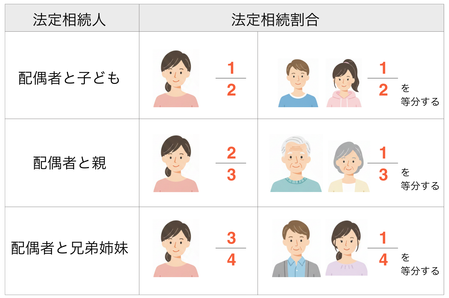法定相続人が2人以上いる場合、それぞれの取り分となる割合を「法定相続分」といいます。これは話し合いの目安になる割合で、誰が相続人かによって異なります。