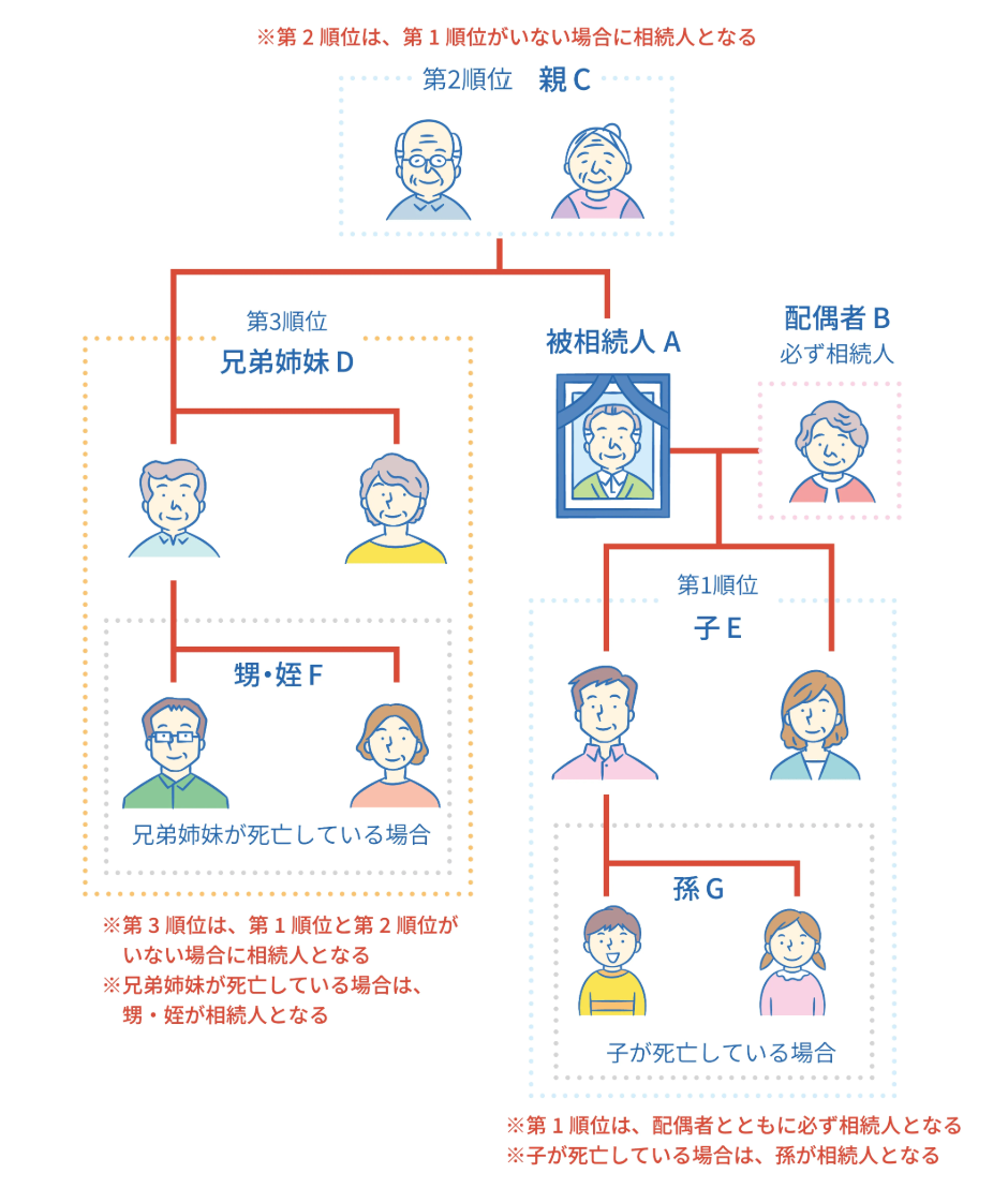 亡くなった人の配偶者は必ず相続人となり、それ以外の親族には以下の優先順位があります。